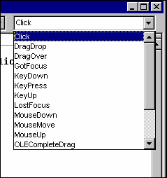 The drop-down box on the right (the procedure box) will show all of the possible events that the control selected in the object box can respond to. So with "cmdExit" selected in the object box, click the down arrow on the procedure box, and you will see all of the events that a command button can respond to.
