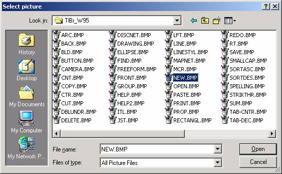 The task at hand now is to repeatedly click the Insert Picture button, select an image, and set the Key property until you have loaded all of the desired images. Upon clicking Insert Picture for the first time, the Select picture dialog box comes up. Navigate to the following folder: \Program Files\Microsoft Visual Studio\Common\Graphics\Bitmaps\TlBr_W95. This folder contains several standard toolbar images. For the first image, click New.bmp, as shown in the screen-shot below: