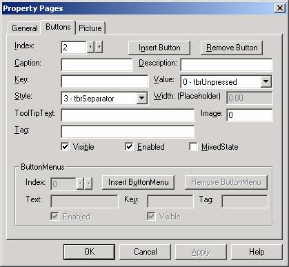 8. On the Buttons tab of the Property Pages dialog, click the Insert Button command button, and set the following properties: