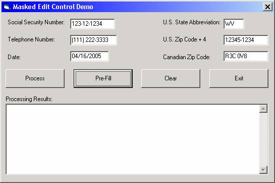 Clicking the Pre-Fill button populates the masked edit boxes with predetermined values (this demonstrates how to populate masked edit controls through code):