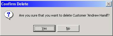 To delete a customer record, click the customer record in the list to highlight it and click the "Delete" button. The following message will be displayed: