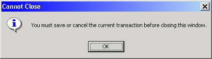 To exit the Customer Maintenance screen, click the "Close" button when the screen is in its "read only" state. The Close button will not be available when you have an "add" or "update" pending. If you attempt to close the screen with the Windows "X" button while you have an "add" or "update" pending, the following message will be displayed: